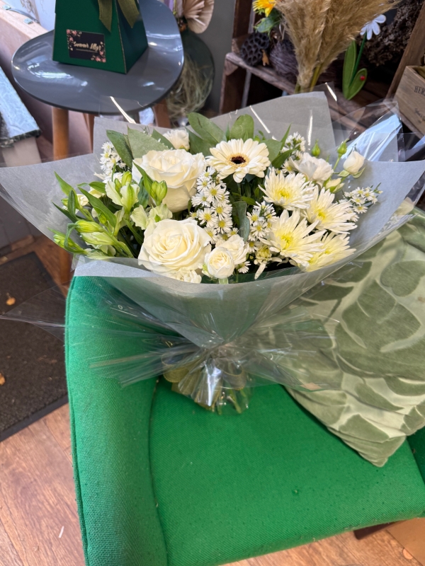 Mixed handtied bouquet of all white blooms simply stunning